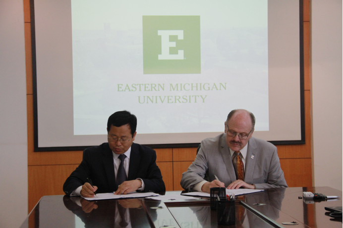 冯国会与詹姆斯·史密斯就两校可能合作的领域进行了全面交流,确立了以师生交流启动两校实质性合作的交流意向,双方在环境、交通、信息等学科的学位项目合作方向进行了深入探讨,达成了合作共识。冯国会与詹姆斯·史密斯分别代表两校签署了“沈阳建筑大学与东密歇根大学本科学位和硕士学位合作备忘录”,正式确立了两校校际交流关系,明确了2+2双学士学位项目和1+1.5双硕士学位项目,并为所有项目学生提供国际合作奖学金。