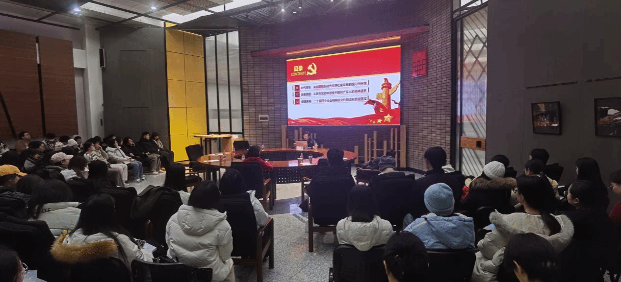 孙雷深耕马克思主义理论与党史研究领域多年,学术造诣深厚,授课兼具理论深度与实践指导意义。宣讲围绕三大核心板块展开。在“时代背景”板块,他分析指出,我国经济社会发展基本面长期向好,但结构性挑战亟待突破,需以历史主动精神在变局中开新局,精准应对风险挑战。在“历史回望”部分,孙雷带领师生回溯百年党史,解读中国共产党人精神谱系的核心内涵。他强调,要从传承红色基因中赓续精神命脉,这一精神谱系是百年奋斗的精神结晶,是激励全国人民前行的强大动力,为应对当下挑战提供了宝贵滋养。在“展望未来”部分,核心聚焦“担当育人使命,培育时代新人”。孙雷系统解读了全会精神,指出要以科学指导思想锚定现代化征程方向,坚守六项原则筑牢发展根基;落实层面需从四维度发力:铸魂定向夯实理论根基、靶向发力破解发展难题、闭环赋能强化制度效能、强基固本筑牢作风保障。他特别强调,师生党员要立足岗位,将全会精神转化为教书育人、科研创新的实际行动,担当培育时代新人的使命。
