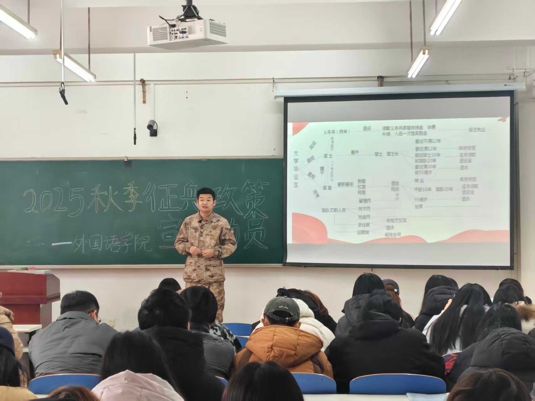 2025年秋季征兵工作已拉开帷幕,为让外国语学院学子更直观了解军营生活、清晰掌握征兵政策,近日,学院邀请学校武装部教师和管理学院八年退伍兵代表开展征兵宣讲活动。