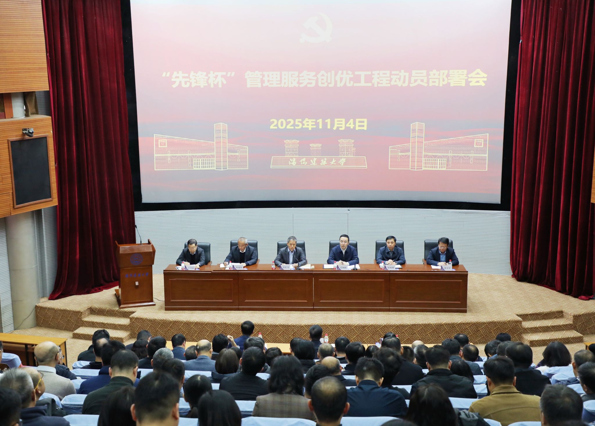 为深入贯彻落实党的二十届四中全会精神,11月4日,学校在新宁科学会堂召开“先锋杯”管理服务创优工程动员部署会。学校党委书记郭长义出席会议并讲话,会议由校党委副书记张佩栋主持。校领导何通海、夏柏树、王凤池、栾方军,党委常委潘瑞、肖阳、林慧出席会议。