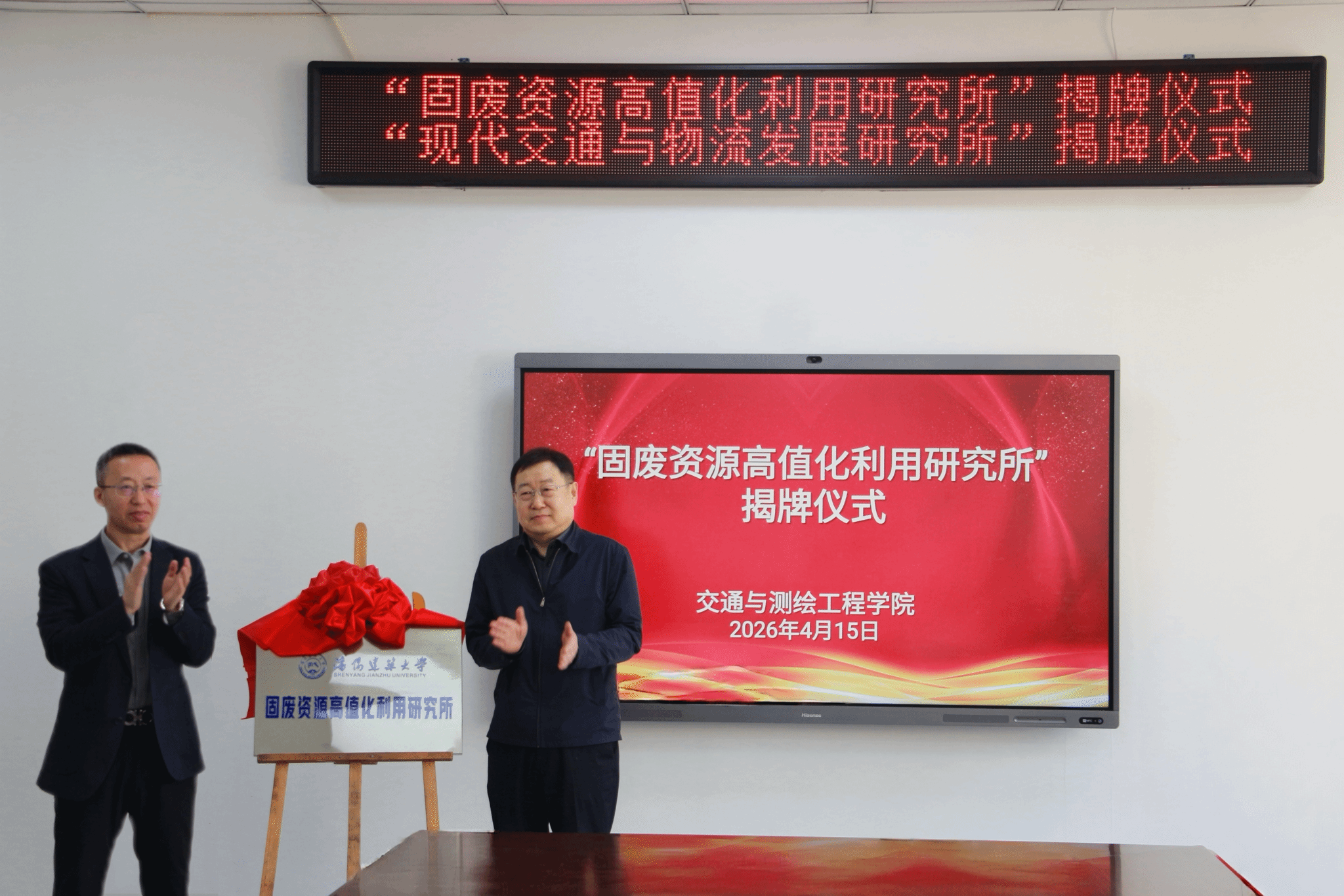 仪式最后,王凤池分别与交通与测绘工程学院、科学技术研究院负责人为 “固废资源高值化利用研究所”“现代交通与物流发展研究所”揭牌。