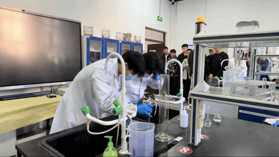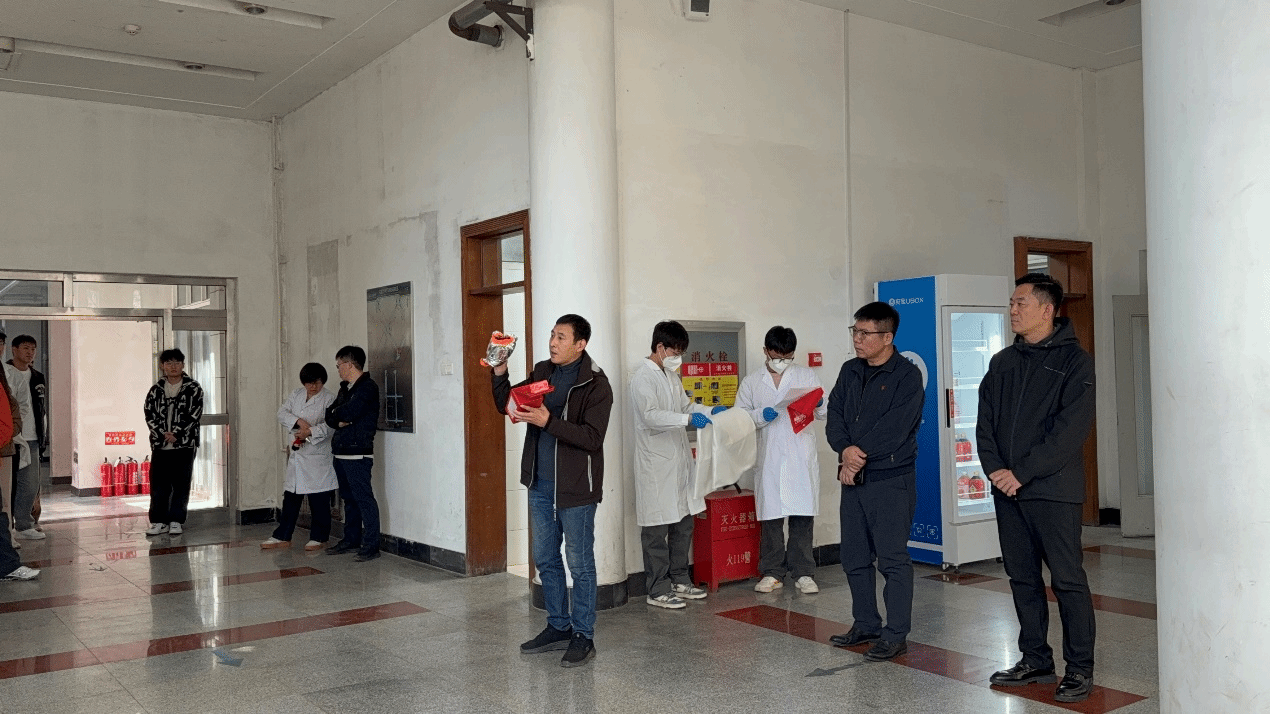 随后,学院实验室安全员、实验室副主任以及实验教师通过现场演示与实物讲解,详细介绍了应急洗眼喷淋器材、灭火毯、防毒面具的正确使用方法以及逃生技巧,为演练的顺利进行打下了坚实的基础。随着“演练开始”的指令下达,实验室安全模拟场景与消防应急疏散演练依次展开。在模拟场景中,师生们迅速应对实验试剂喷溅眼部等突发情况,展现了良好的应急反应能力。在消防应急疏散环节,师生们用灭火毯、防毒面具等工具,有序疏散至楼外空旷场地,确保所有人员的安全撤离。